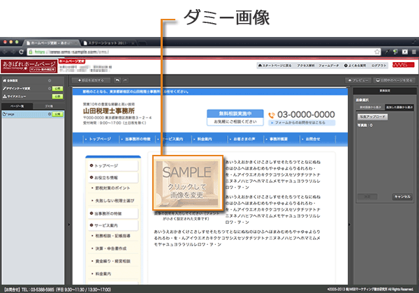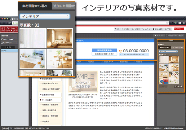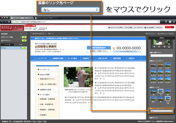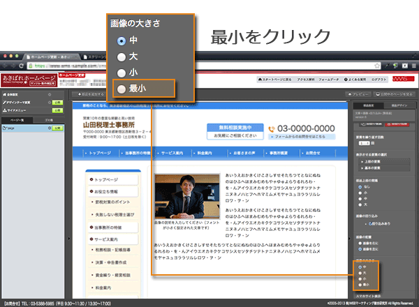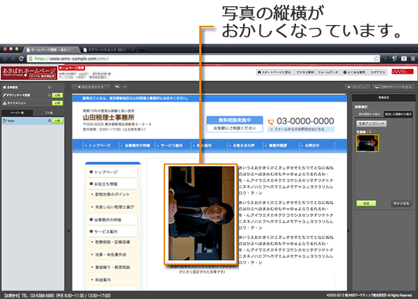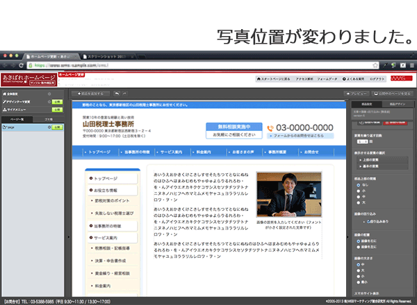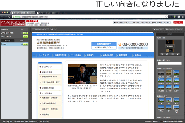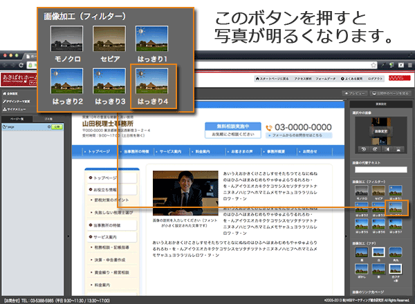 以上ご説明しましたように、【あきばれホームページ作成】なら写真を表示したり、加工したり、あるいはレイアウトを変更するのがとても簡単に行えます。管理画面でマウスクリックするだけで、写真を使った本格的なページを作成することができるのです。