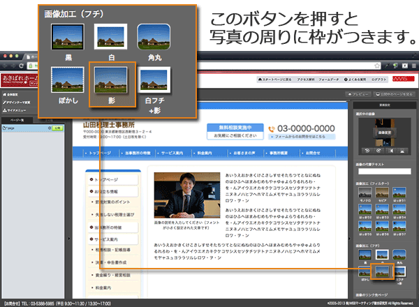 枠をつけたり、明るさを変更するといった写真の加工も、専門ソフトを使うことなく、管理画面で簡単に実行できます