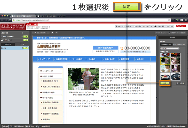 5)では着物の写真素材から1枚選んでみましょう。マウスで使いたい写真を選択して「決定」ボタンをクリックします。