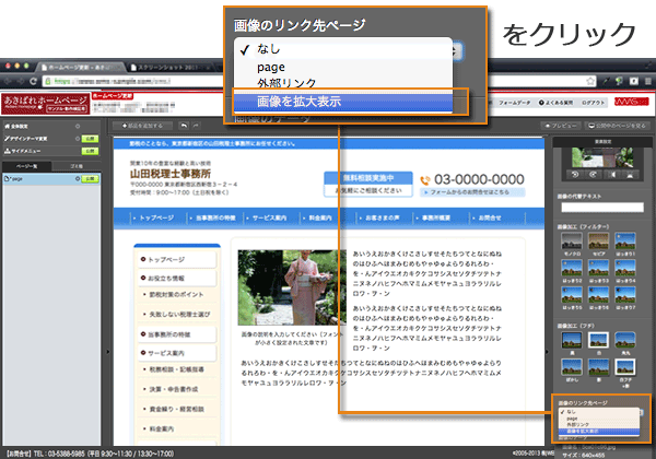 貼り付けた写真を作成したホームページで拡大して表示したい場合も、簡単な操作で実現可能です。